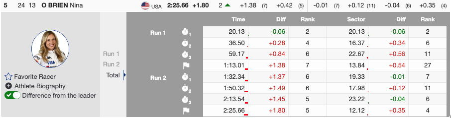 Nina O’Brien delivered one of the standout performances of the day, charging to a career best fifth place with an impressive second run and rounding out the top five with three Americans inside the top five. Her tactical adjustments from Run One were immediately evident. Skiing aggressively from the top, O’Brien lit up the green early and carried her speed with purpose all the way to the finish. What stood out most was her composure. Her second run showcased calm, tactically aggressive, and connected skiing, allowing her to remain error free while staying engaged with the snow and managing her speed efficiently from top to bottom, a key step forward from the mistakes that have previously cost her speed and results.