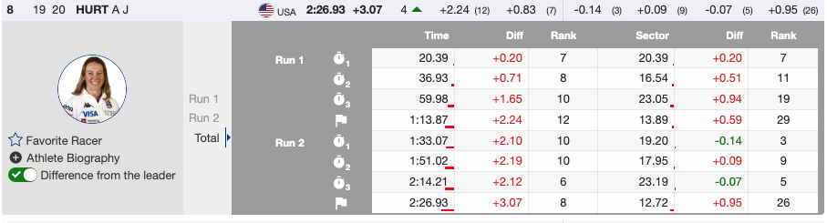 Camille Rast was also unable to hold onto a podium position after a strong first run. She started the second run aggressively, showing green splits from the top, but nearly went down in the middle section where the course tightened and demanded a shift in tactics. Without enough speed coming off the pitch and with several small mistakes adding up, Rast slipped back to fourth place. On a day when the second run required near perfection, those minor errors were enough to keep her off the podium.