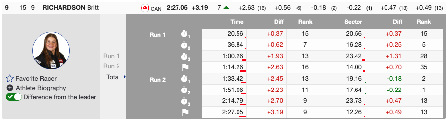 Canada’s Britt Richardson delivered a hot second run to move into the top ten in ninth place. She was aggressive and error free in the opening section, made a mistake in the middle, but recovered well and kept her speed intact. From that point on, Richardson skied cleanly and with intent, maintaining enough pace to move ahead and cap off a strong result.