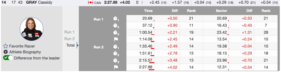 Cassidy Gray finished the day in 14th place, backing up her solid first run with another consistent performance. While a few late, low line choices cost her some speed, the overall effort showed progress and stability. Two solid runs to the finish should serve as a confidence boost as she continues building momentum heading toward the Olympic Games.
