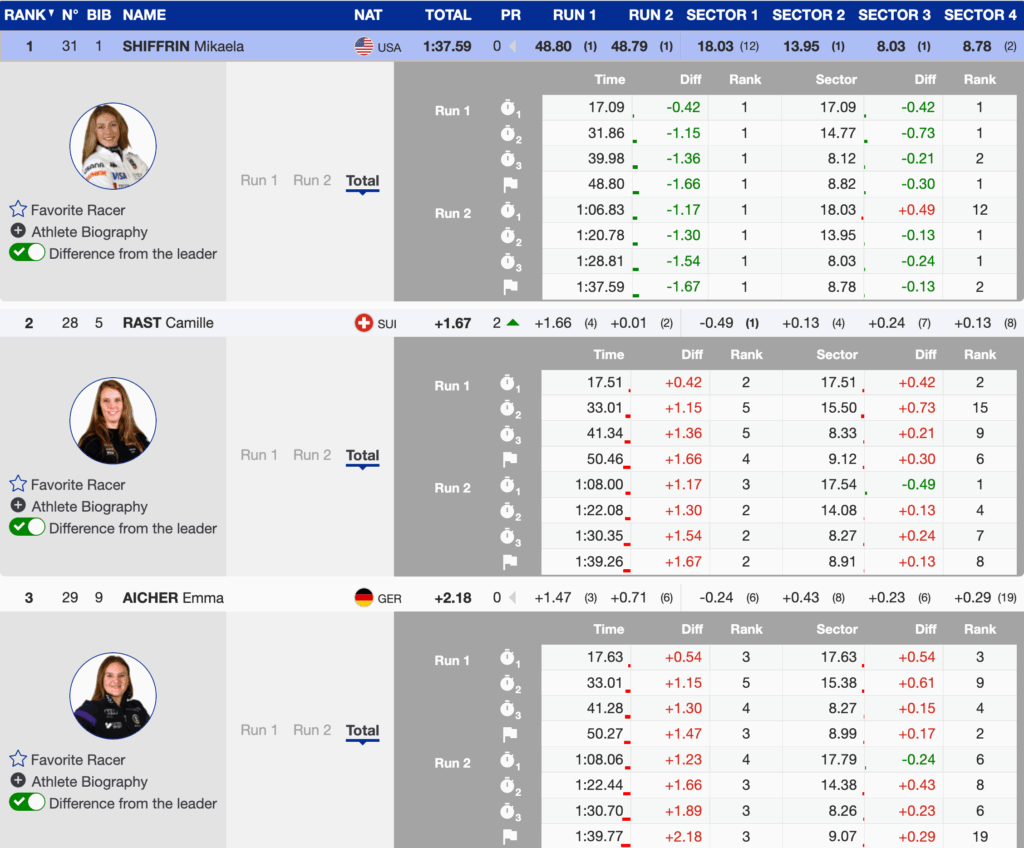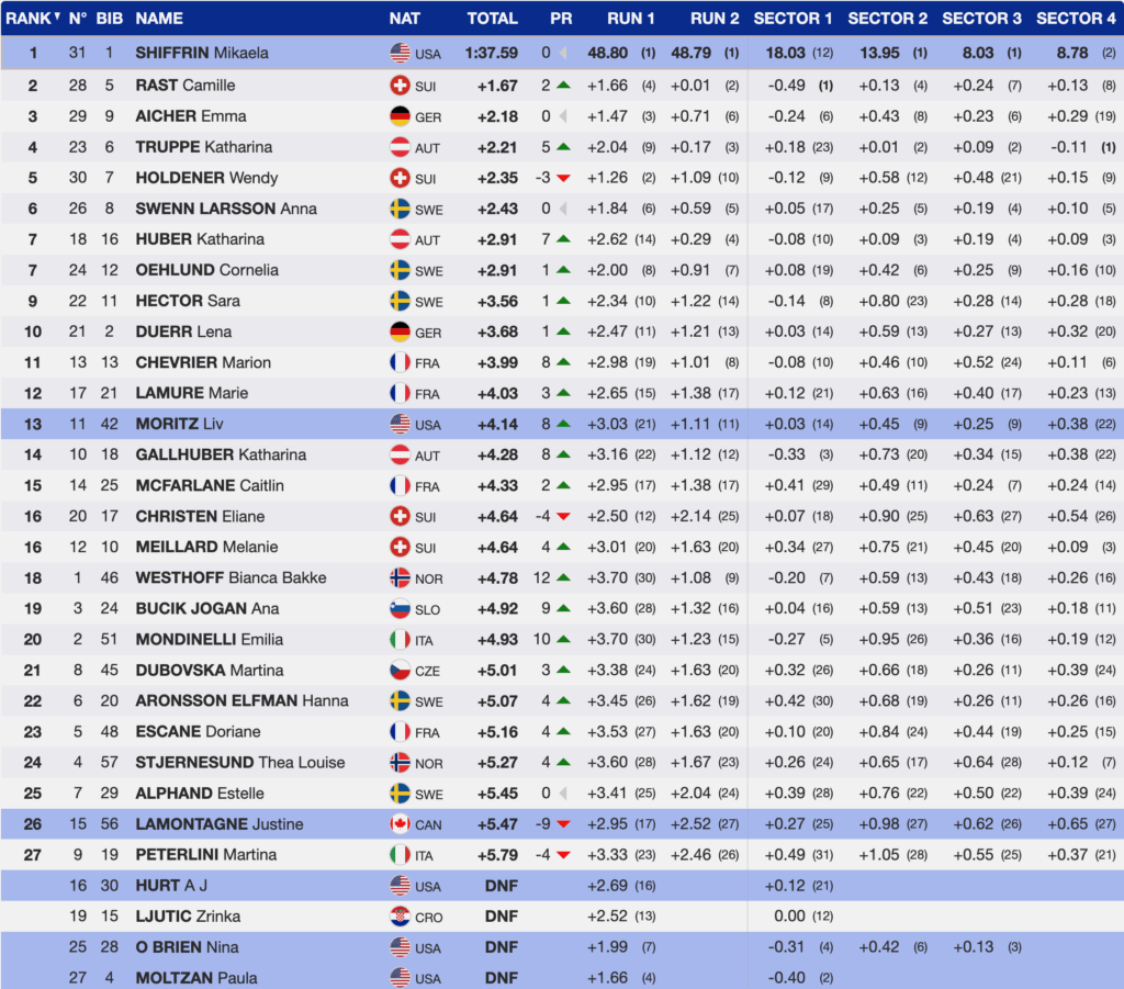 1st — 🇺🇸 Mikaela Shiffrin (USA) — 1:37.59 — YOB 1995