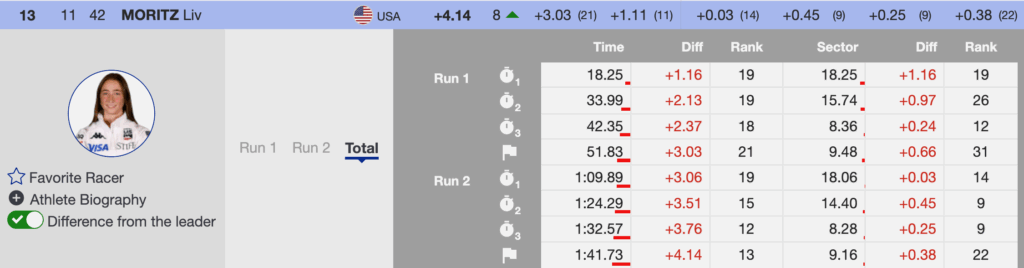 “I’m so, so happy,” Moritz said afterward. “I went into the second run with no expectations because I’d never made a second run before. I’m just really proud of myself, and I think what makes the U.S. team so strong is the camaraderie—everyone is genuinely happy for each other. Coming into the finish and sharing that with the team means so much.”
