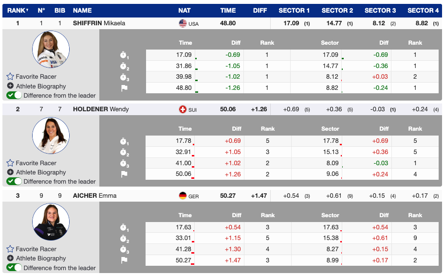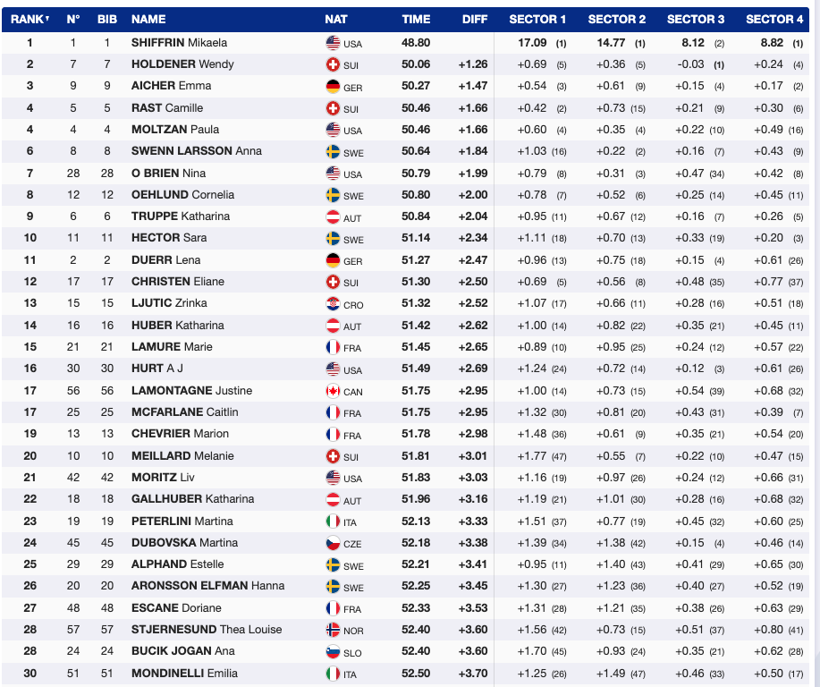 - Bib 1 — 🇺🇸 Mikaela Shiffrin (USA) — 1995 — 48.80