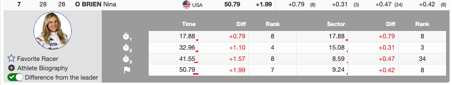 From bib 28, Nina O’Brien skied into an impressive 7th place, continuing to build confidence throughout the weekend. She came out of the gate with great attack and noticeably more zip than those around her, ranking third in the middle section and carrying strong speed into the finish.It was a confident, assertive run that stood out and puts her in a strong position heading into the second run.