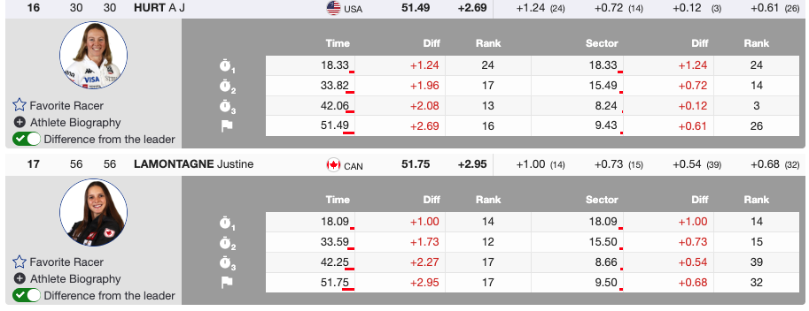 On the North American side, Justine Lamontagne 🇨🇦 continued the momentum, charging from bib 56 into 17th place. Primarily a giant slalom skier, Lamontagne stepped into the slalom lineup after teammates Laurence St-Germain and Ali Nullmeyer were sidelined with lingering injuries, making the most of her opportunity with a strong, confident run.