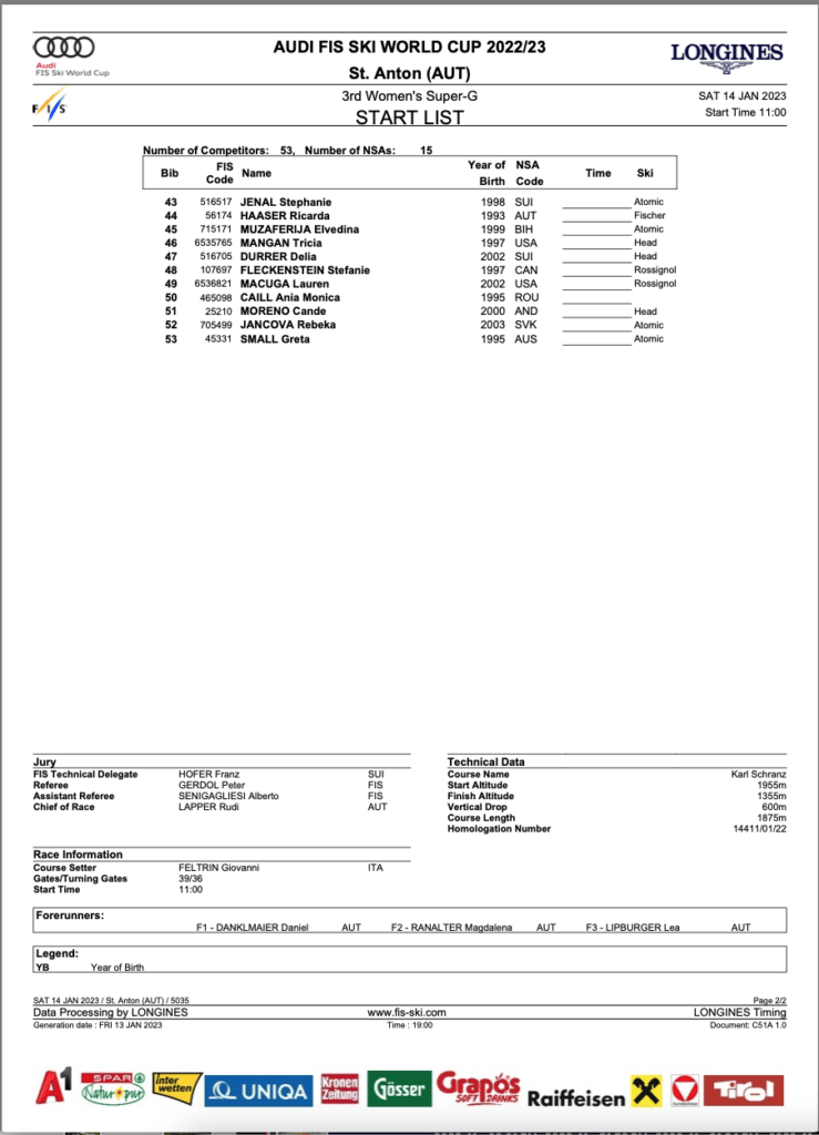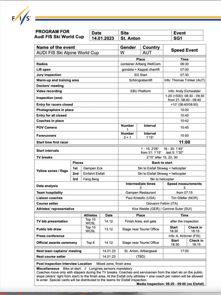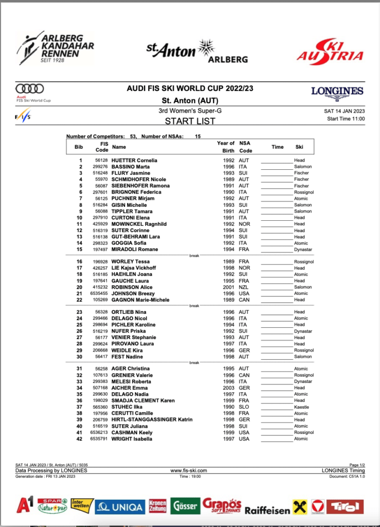 Due to a winter storm, both scheduled downhill training runs in St Anton were impossible. Therefore, they could not host the scheduled race. Instead, tomorrow will be the first of two women’s World Cup super-G races.