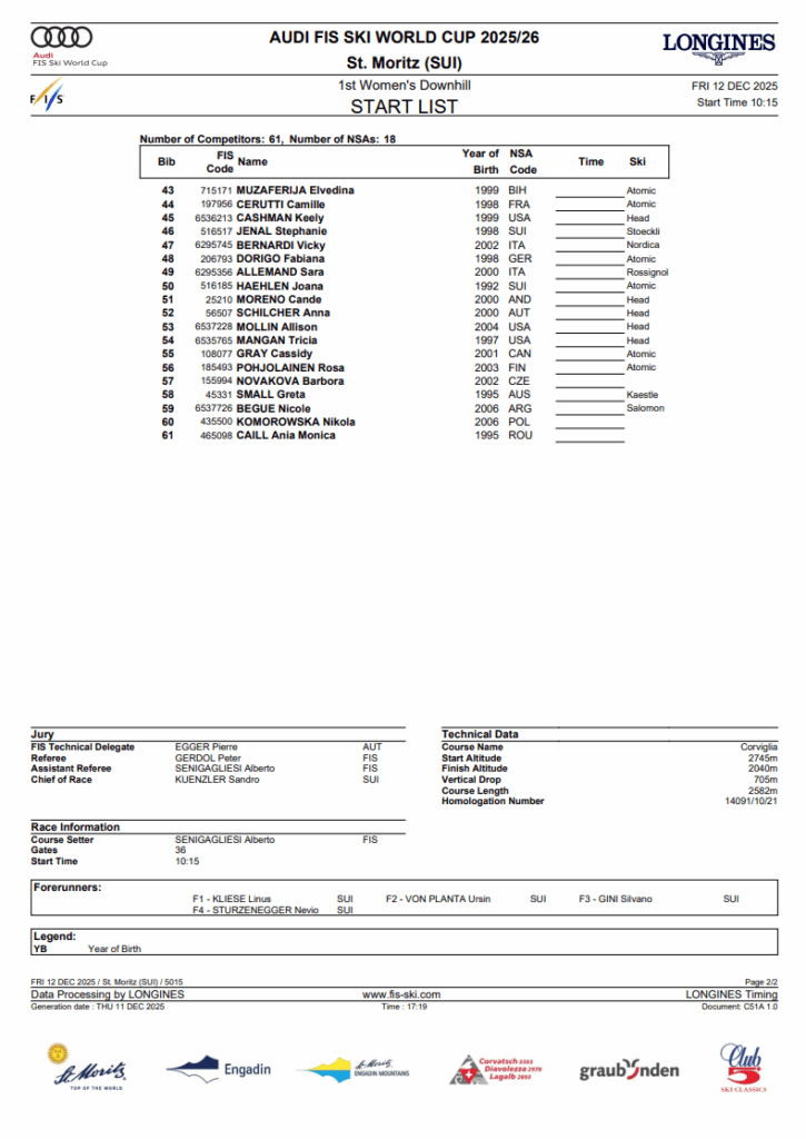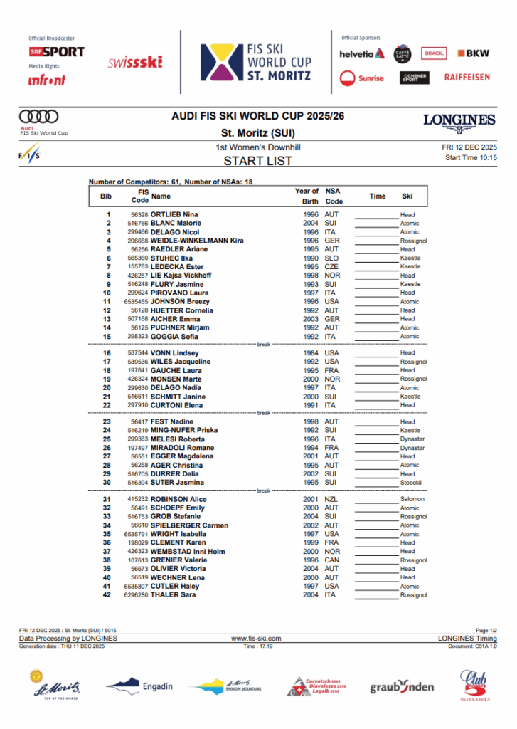 St. Moritz women’s downhill: start list and North American program