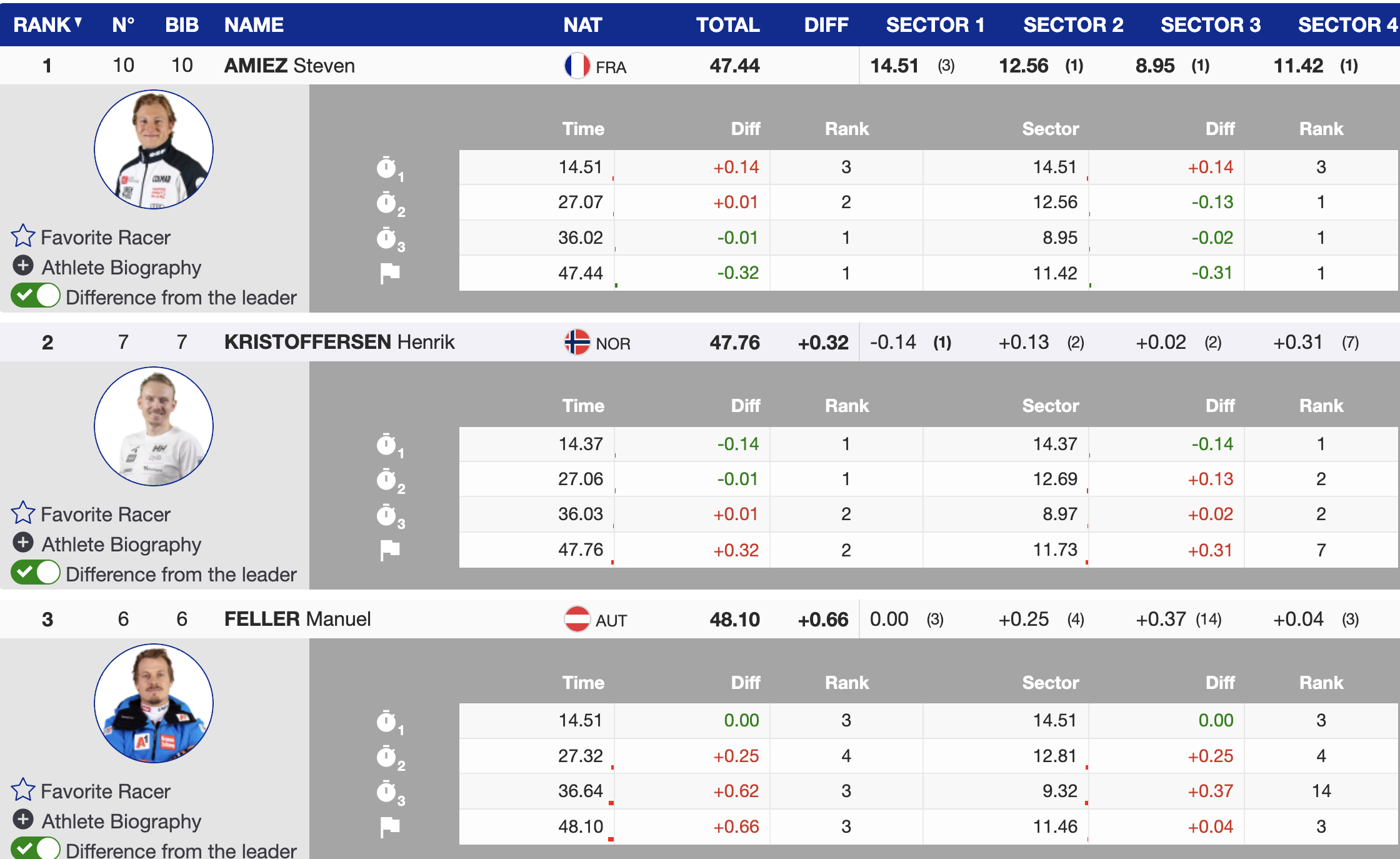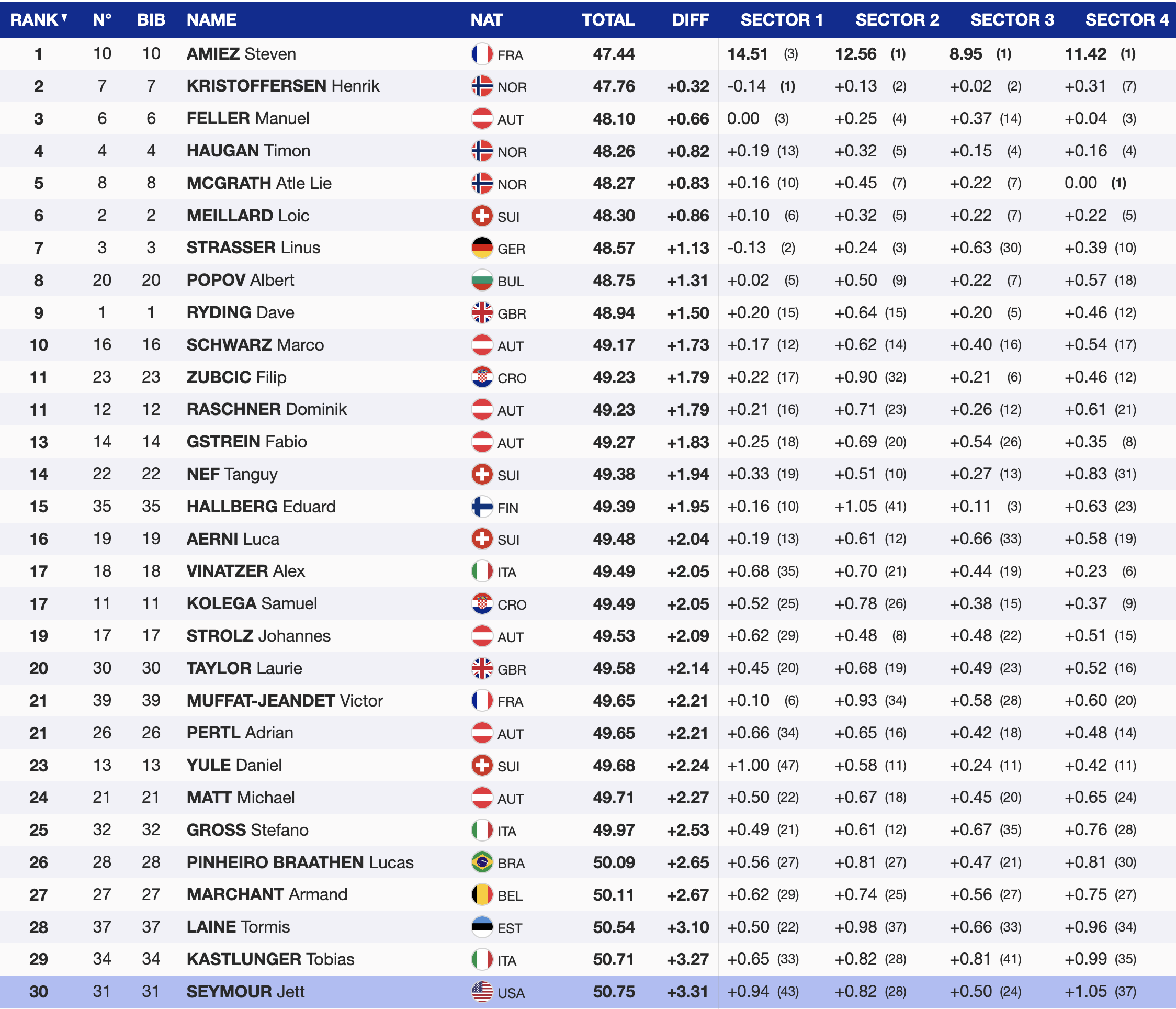 However, the race is tight, with six athletes within a second of Amiez’s best time. That group includes Kristoffersen, Feller, Norway’s Timon Haugan, his teammate Atle Lie McGrath, and Swiss star Loïc Meillard.