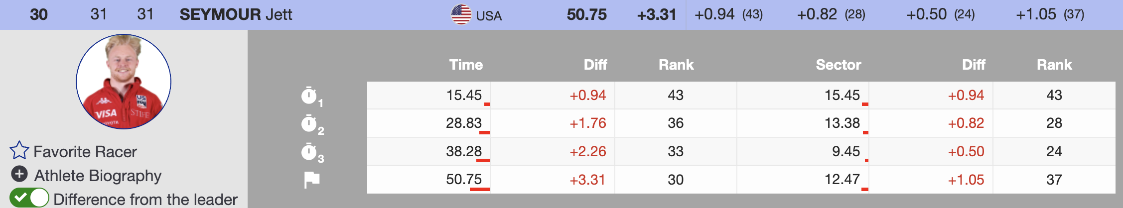 Seymour was the only North American to qualify. Although Canadian veteran Erik Read finished one spot 0.18 seconds behind Seymour in 31st.
