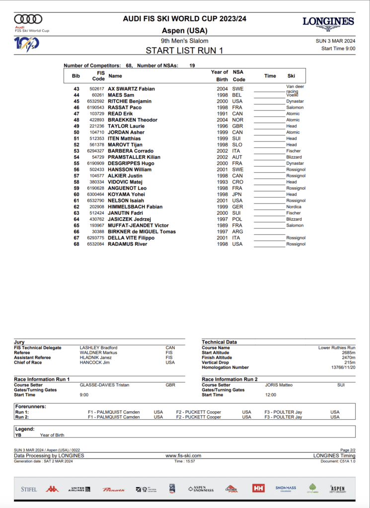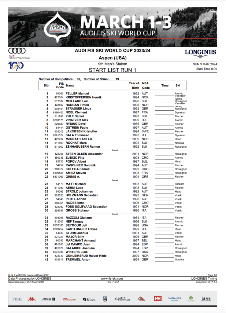 First run Start list and daily program for Sunday, March 3rd Stifel Aspen Winternational men’s World Cup slalom