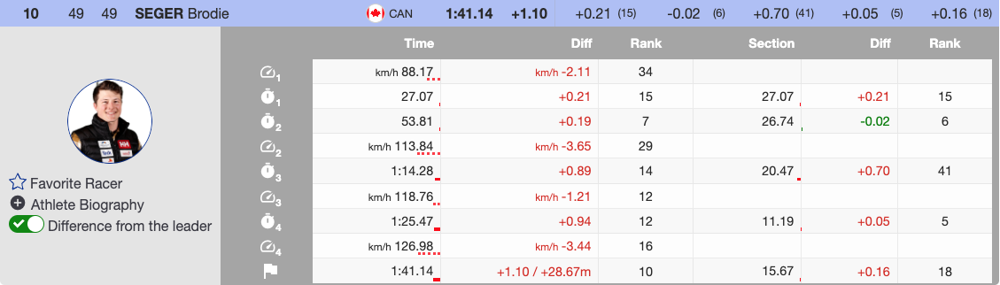 Bib 49, Seger delivered an exceptional run, finishing 10th at 1.10 seconds back. However, the $5,000 Stifel Bibo Award, given to the racer who gains the most positions from their start number, went to the Czech Republic’s Jan Zabystřan. Starting with bib 54, Zabystřan climbed to an impressive 11th place, claiming the prize.