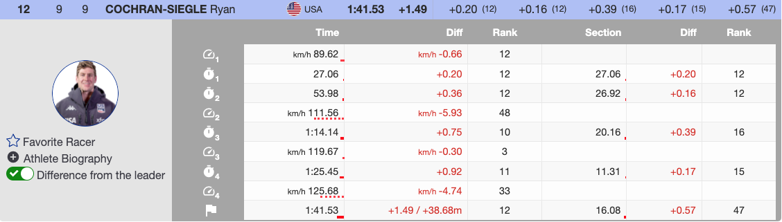 Cochran-Siegle, the second U.S. racer, faced a dramatic moment when a mistake almost ended his run. Despite recovering to finish safely, his time of 1.49 seconds off the lead left him outside podium contention.