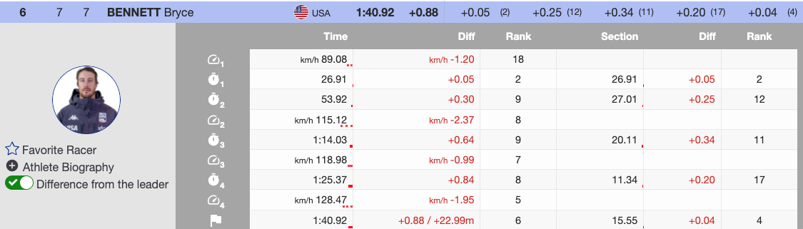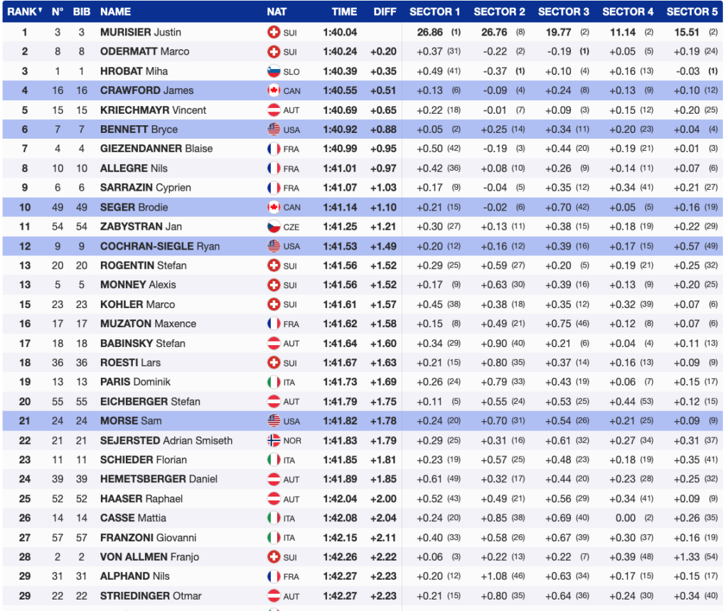 Bennett was the first North American down the course. He delivered a solid performance, momentarily taking third place, 0.88 seconds off Murisier’s pace. Next, Odermatt attacked the course, leading through the first 1:13.35 but losing time on the final stretch to finish 0.20 seconds behind his teammate, securing second.