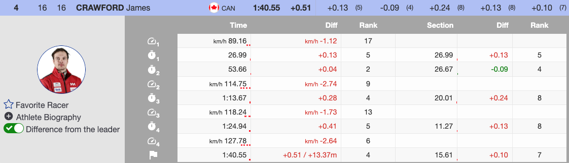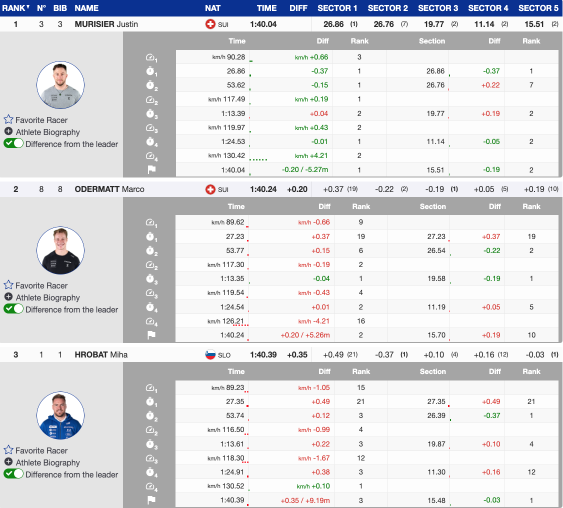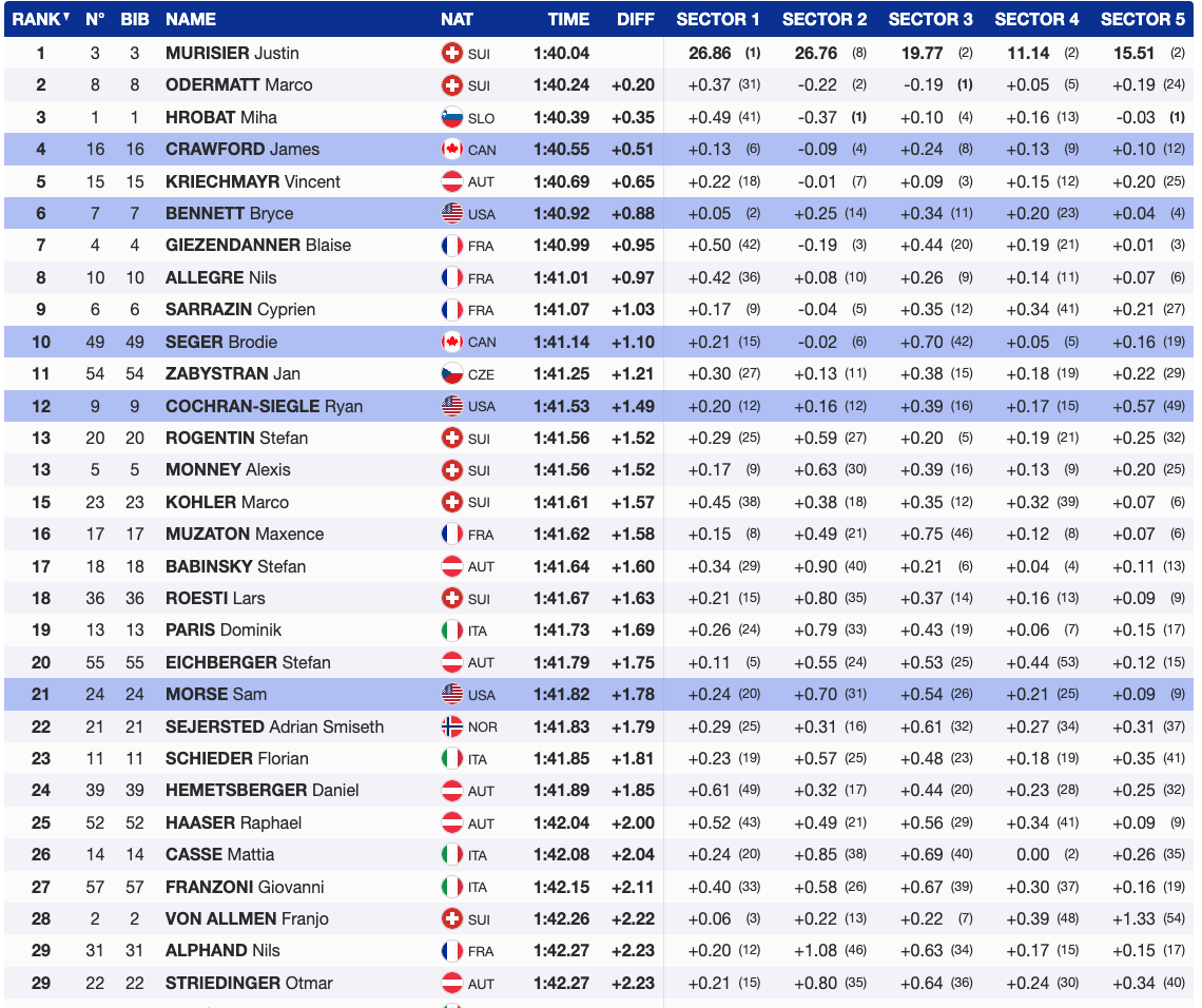 Sarrazin, the first race favorite wearing bib six, followed shortly after. By this time, Murisier held the lead with a 0.35-second advantage over Hrobat. While Sarrazin’s aggressive style suited the course, minor mistakes pushed him to a ninth-place finish, well behind the leader.