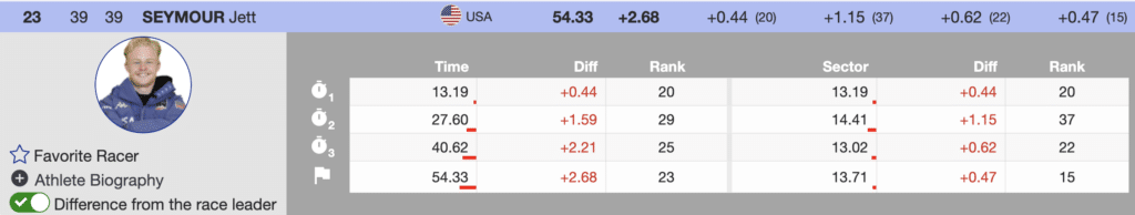Stifel US Ski Team’s Jett Seymour was the first North American to ski. Notably, Jett has qualified for two previous second runs this season. He did it again today before family and friends and ignited the California spectators. Seymour skied well on the dry western snow and delivered the 23rd fastest first run time (+2.68). He will be the eighth racer to start the second run.