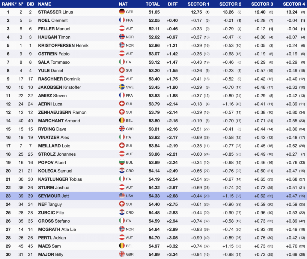 Strasser earned two World Cup victories this season in Kitzbühel and Schladming, Austria. He is also currently second to Feller in the season’s slalom standings. He seemed to love the western US surface and skied with balance and precision, rarely getting offline during his run. His performance was rewarded with a significant lead.