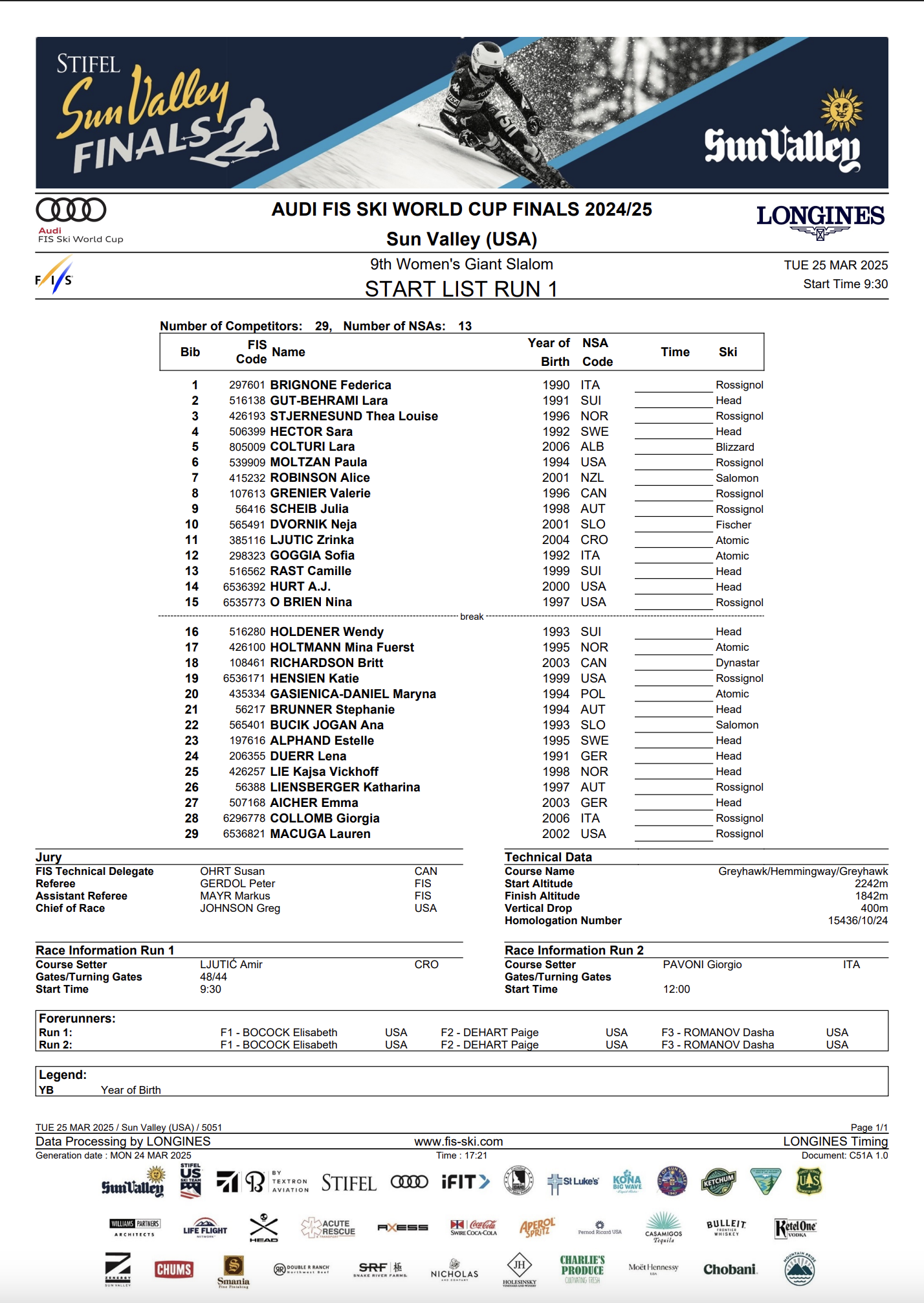 Twenty-nine athletes from 13 countries will compete in the Stifel Sun Valley World Cup Finals giant slalom. This includes a group with 500+ points accumulated across all disciplines throughout the season—Germany’s Emma Aicher, Austria’s Katharina Liensberger, Norway’s Kajsa Vickhoff Lie, and Stifel U.S. Ski Team’s speed star Lauren Macuga—as well as Italy’s Giorgia Collomb, the Junior World Champion.