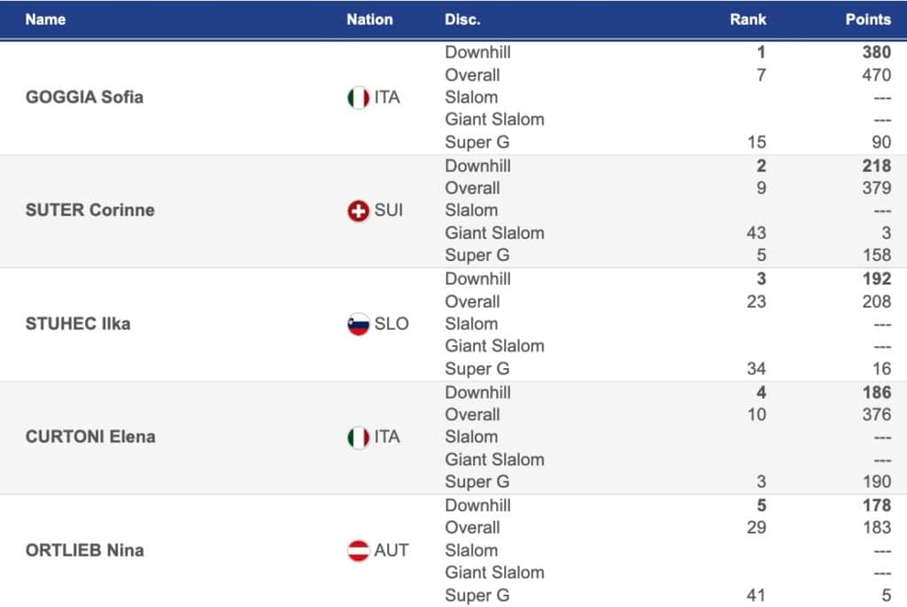 World Cup downhill leaders prior to Cortina