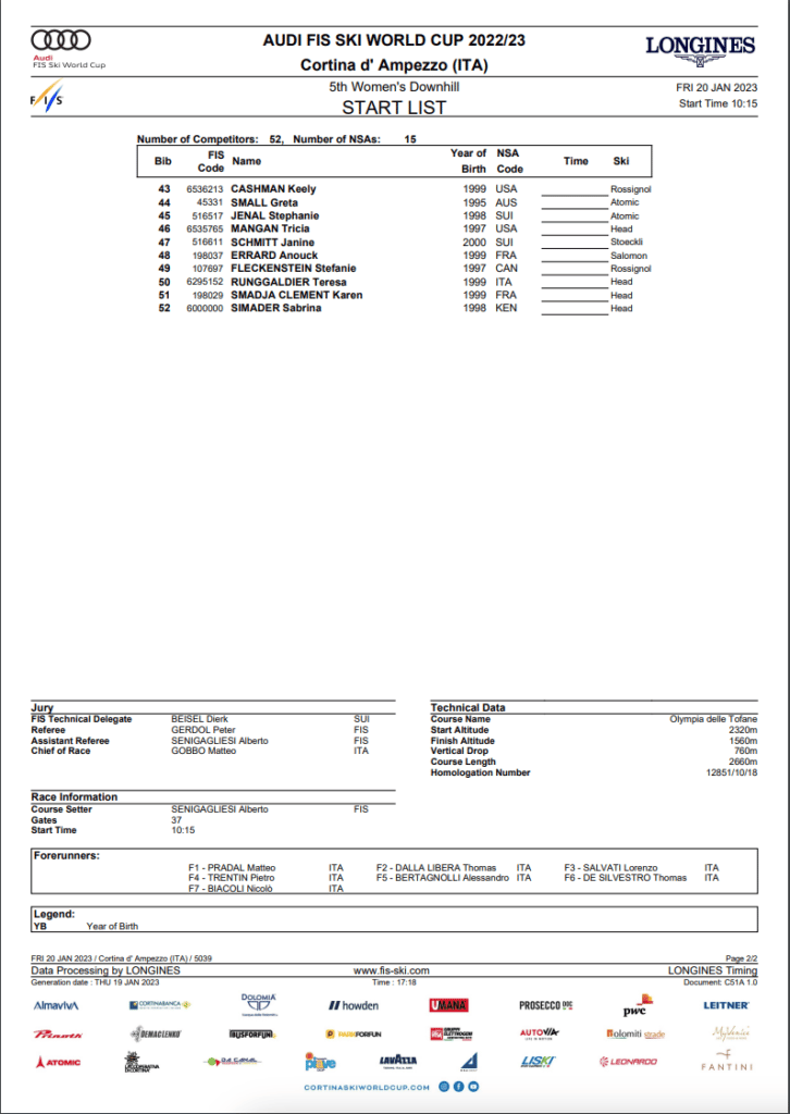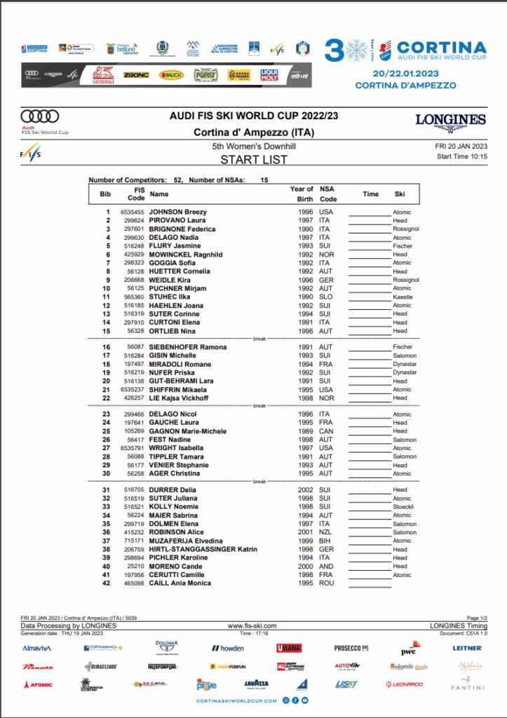 North American entries include seven women – four from the Stifel US Alpine Team and one from Alpine Canada Alpin. Each nation also has an independent racer entered. This week, US athlete, Lauren Macuga, is not in Cortina. Macuga is competing in the World Junior Championships in St. Anton.