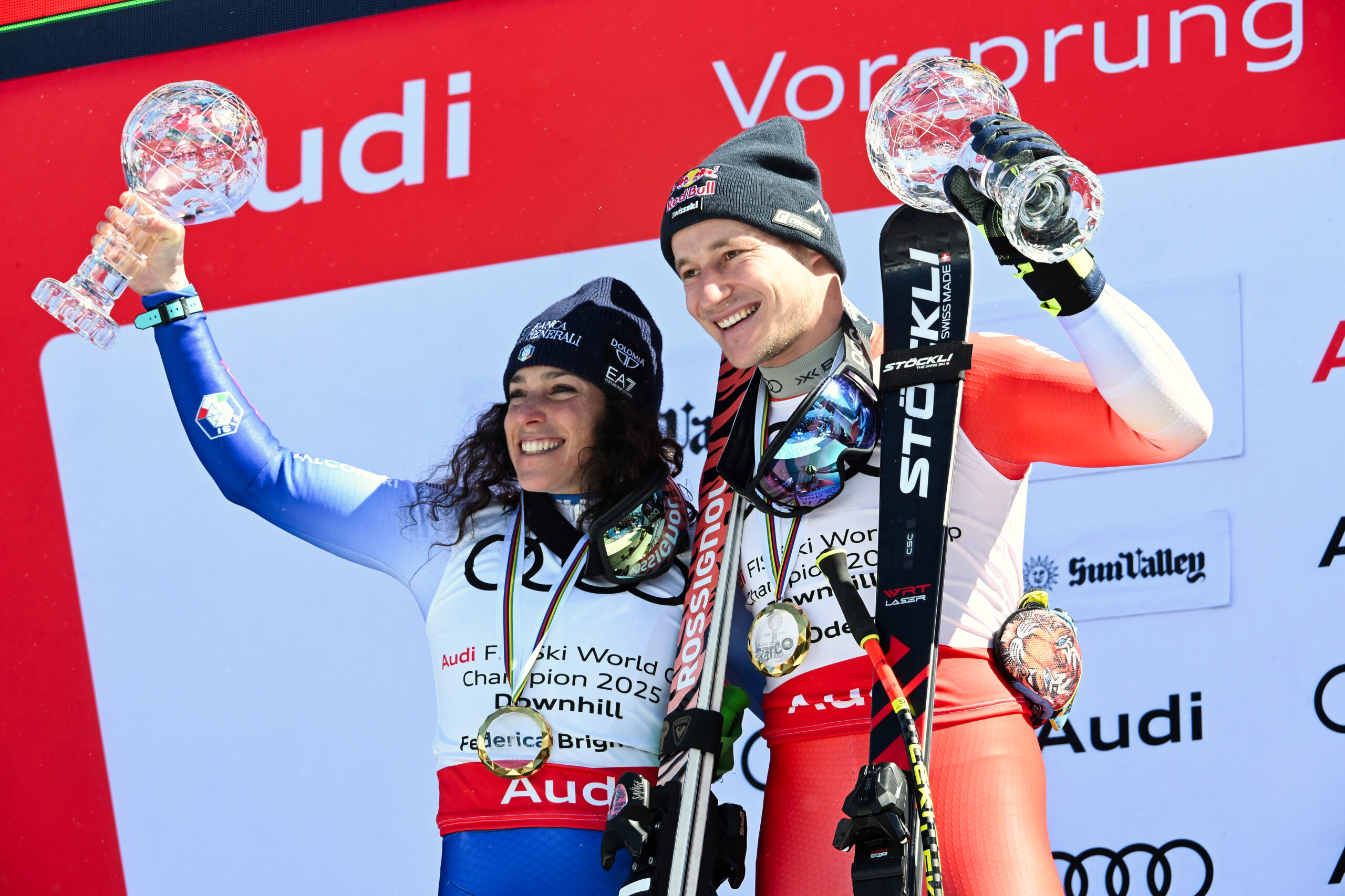 The official World Cup awards ceremony for the men’s and women’s downhill titles took place Saturday afternoon on the main stage at Sun Valley. Fans turned out in force to cheer the season’s champions, bringing energy and enthusiasm despite the missed races.