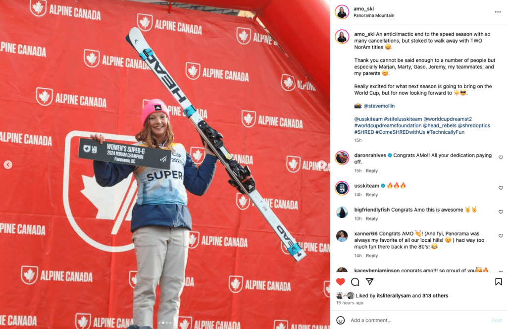 She stated on social media, “An anticlimactic end to the speed season with so many cancellations, but stoked to walk away with TWO NorAm titles.”