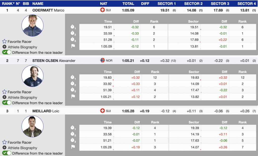 On a sunny Friday morning in Aspen, Switzerland’s Marco Odermatt dominates the first run GS leaderboard. Norway’s 22-year-old Alexander Steen Olsen trails behind him by 0.12 seconds. Following closely is Odermatt’s teammate Loic Meillard, who is lagging by 0.19 seconds. Moreover, six racers are within one second of the leader.