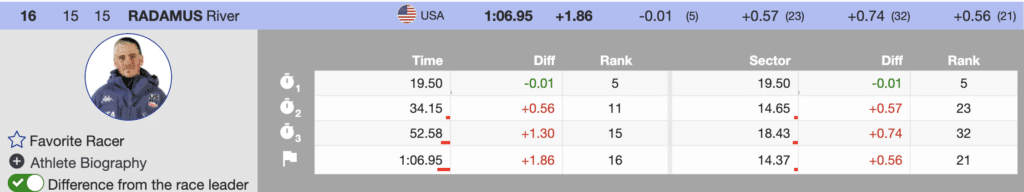 Despite skiing strongly and leading Odermatt in the first timing sector, Radamus lost crucial time after the summer road, finishing the morning run trailing by 1.86 seconds. As the first run concluded, he was in 16th place, and he realized he needed an outstanding second run to replicate his Palisades Tahoe success.