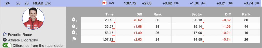 Canada’s veteran Erik Read continues to search for his best form. Today, he crossed the finish with the second slowest time at that point of the race and finished the morning 24th (+2.63).
