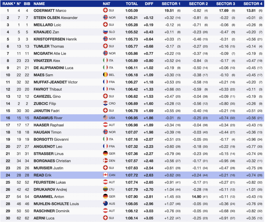 Today, eight athletes with bibs above 30 could qualify for the afternoon finale. The fastest was bib 32 France’s Victor Muffat-Jeandet 11th (+1.18). Switzerland’s bib 62 Luca Aerni, 30th (+3.05), was the racer last to qualify. There were 24 racers who could not finish.