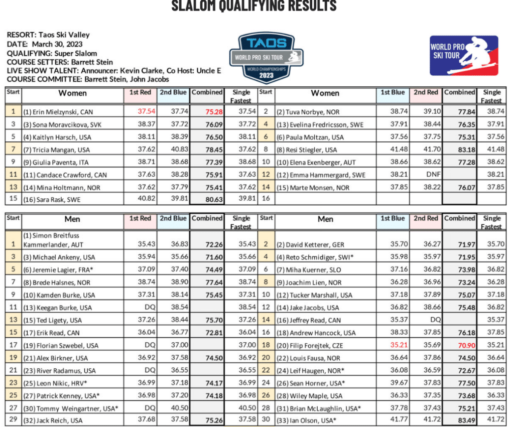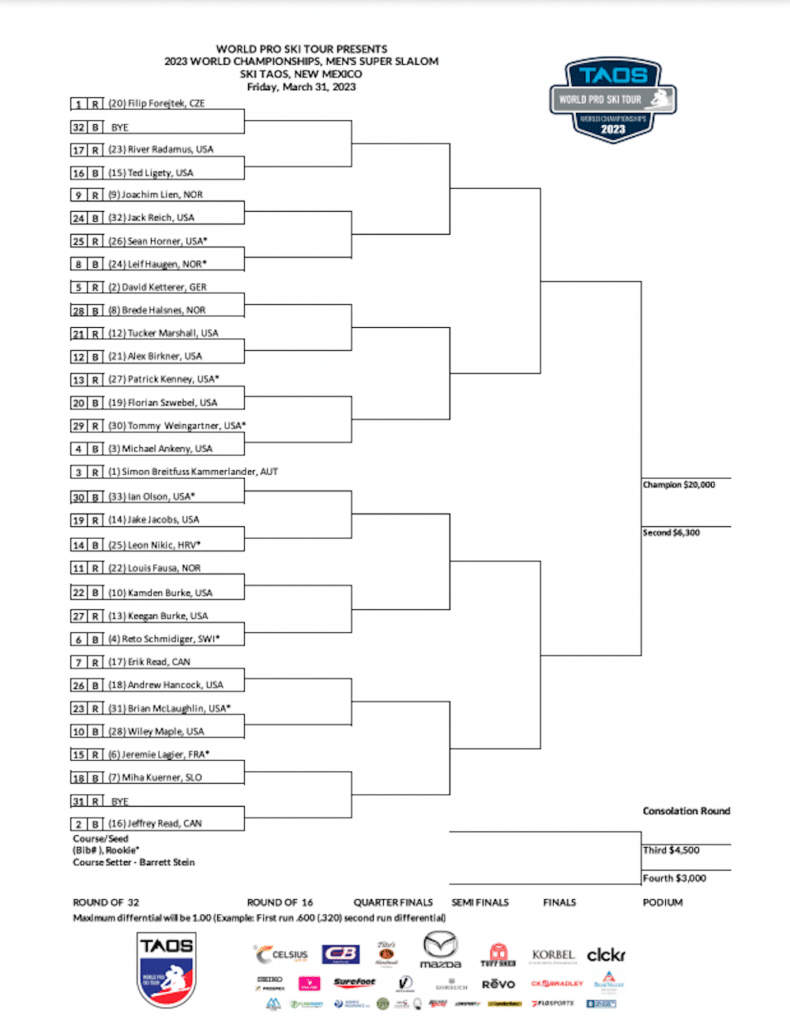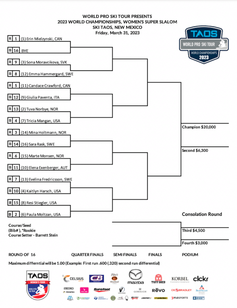 After Thursday’s qualifying rounds, here are the men’s and women’s brackets for the World Pro Ski Tour 2023 World Championship Super Slaloms hosted by Taos Ski Valley in New Mexico.