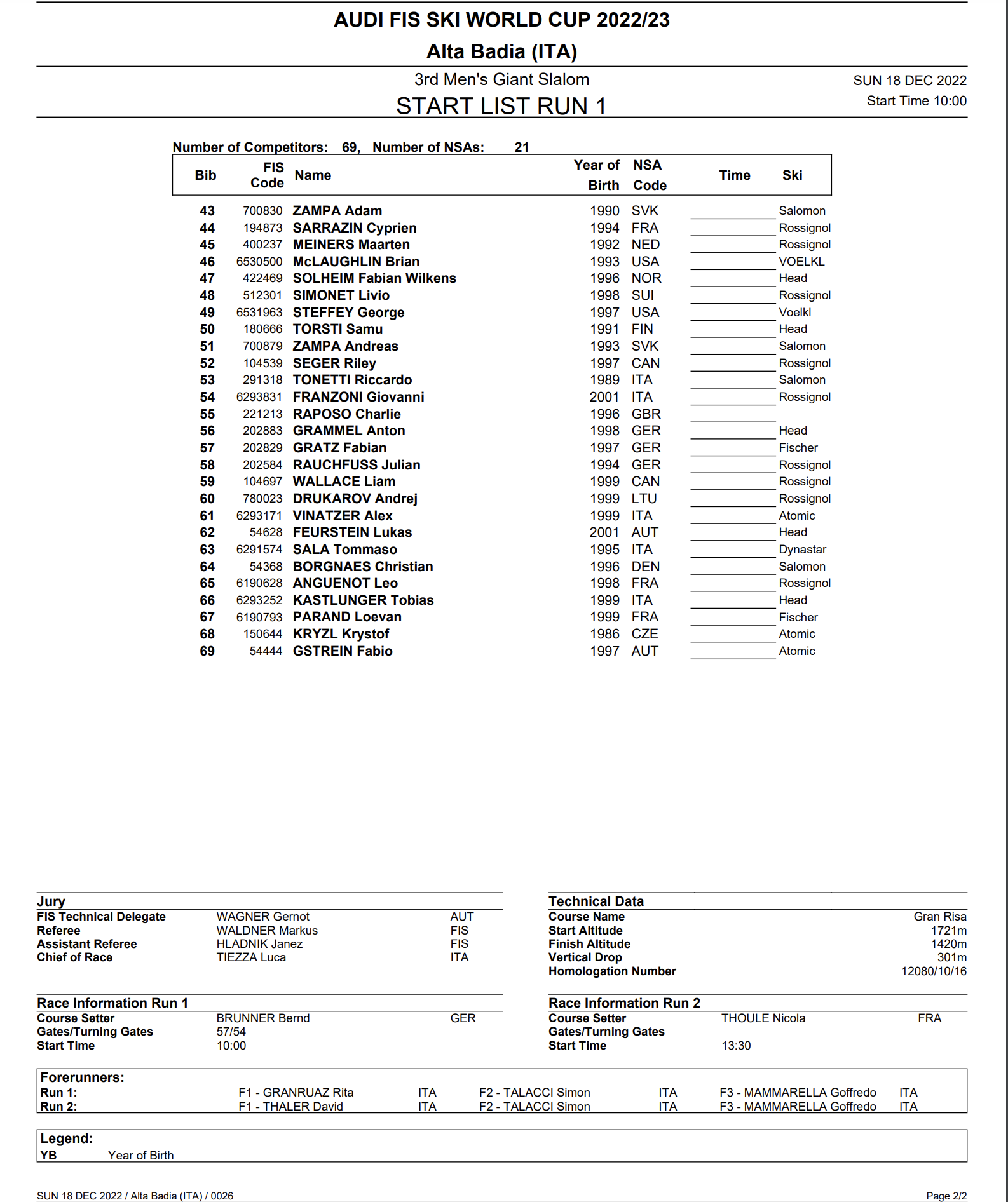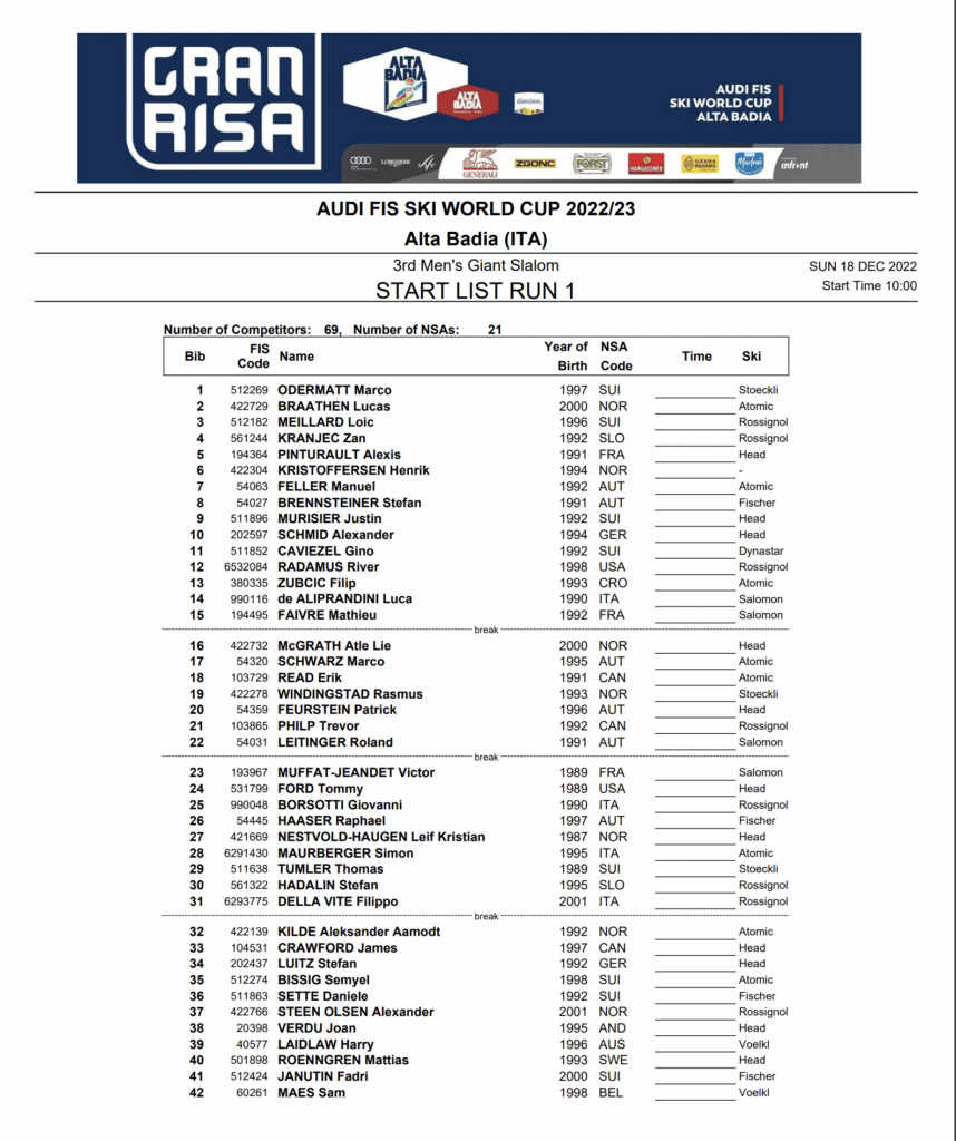 Start list and program for the December 18th Alta Badia Giant Slalom