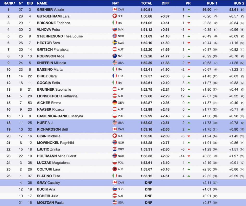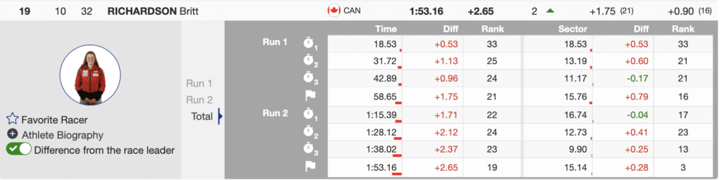 Britt Richardson of Canada ended the day +0.14 behind Hurt. This was Richardson’s third top-20 result in a GS World Cup.