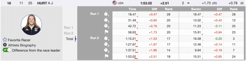 Stifel US Ski Team athlete AJ Hurt fearlessly charged out of the gate, determined to maintain a swift and direct tempo throughout the course. Although she encountered a slight delay towards the end, resulting in a minor loss of speed, she finished just 27 hundredths of a second behind Stephanie Brunner, who was sitting in the leader’s chair. This earned her an 18th-place result.