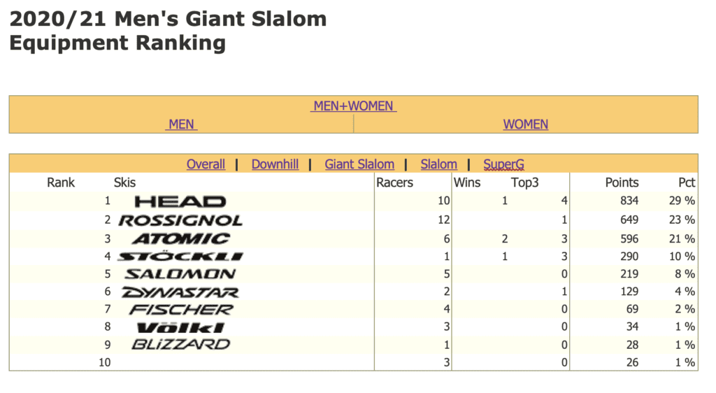 Sidebar: If you like the finer details, have look at the manufacturer’s rankings below. Some GS skis have a reputation for performing is spring-like conditions, like Atomic/Salomon, others on water-injected/ice, such as Rossi/Dynastar/Fischer. And on the artificial and grippy conditions, like in Alta Badia, Head was front and center.