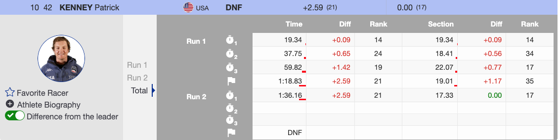 The U.S. had two athletes in the second run, but only Radamus finished. Independent racer Patrick Kenney, who impressed by qualifying with bib 42, started strong but went down on his hip midway through his run. He did not finish, ending his day early in front of an eager home crowd.