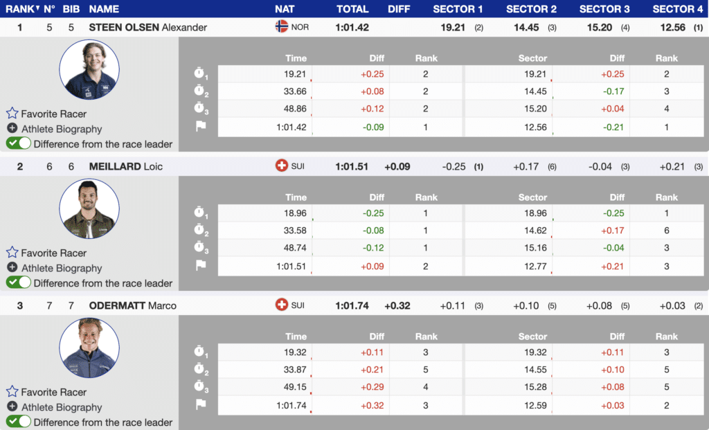 After Saturday’s first run of GS in Aspen, Colorado, the top three remain unchanged from yesterday. However, today, the leader isn’t Switzerland’s Marco Odermatt but the 22-year-old Norwegian Alexander Steen Olsen. Odermatt trails in third place, 0.32 seconds behind the leader, with his teammate Loic Meillard closely behind the Norwegian in second, just 0.09 seconds off the lead.