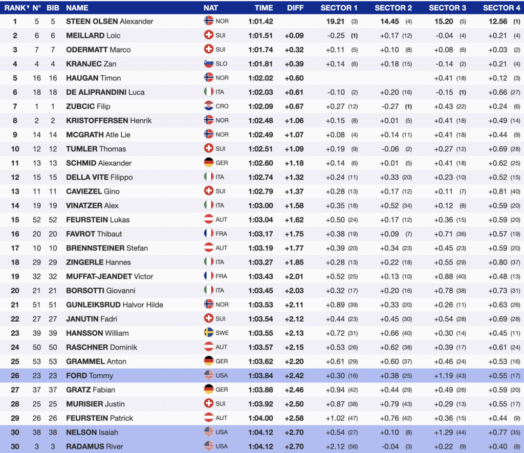 While the top three led the morning run, there were four more contenders within a second of Steen Olsen. Slovenian Zan Kranjec secured the fourth fastest time, trailing by 0.39 seconds, while Norwegian Timon Haugan followed closely behind, just 0.60 seconds off the pace. Italian Luca De Aliprandini and Croatian Filip Zubcic are also within striking distance. With such tight competition, the stage is set for an exciting second-run showdown. Meanwhile, Henrik Kristoffersen sits in eighth place, trailing by 1.06 seconds, but he’ll need a stellar second run to mount a challenge for the podium.