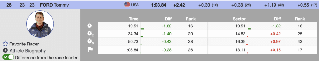 Next up for the Stifel US Ski Team was Tommy Ford. Unable to complete yesterday’s first run, Ford encountered some challenges again today. Despite this, he skied well before the costly mistake and, secured his spot among the top 30 and advanced to the second run. By the end of the morning session, he found himself in 26th position, trailing Steen Olsen by 2.42 seconds.