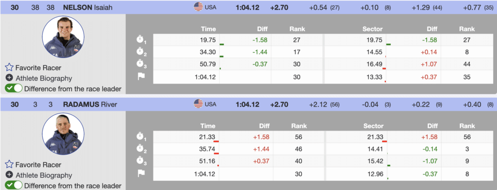 It was incredibly thrilling to see their teammate Isaiah Nelson make it to the inaugural second run of his career. With bib number 38, Nelson raced down the course and crossed the finish line, tying with his teammate River Radamus for 30th place. He will be the second racer to hit the slopes for the second course.