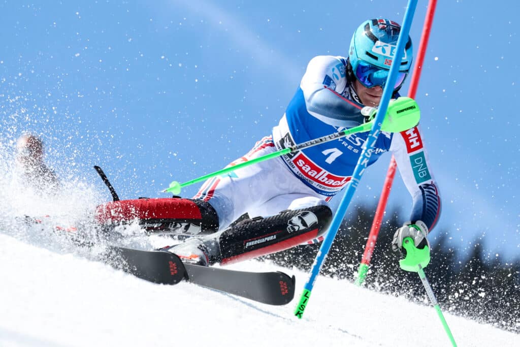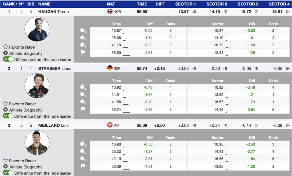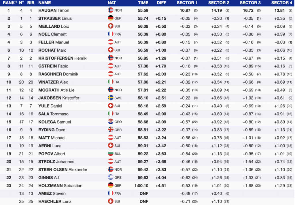 Strasser took advantage of running first on the soft snow, moving through each gate with a promising rhythm. His pace held strong until Timon Haugan of Norway came through the finish wearing bib-4, beating the German’s time (-0.15).