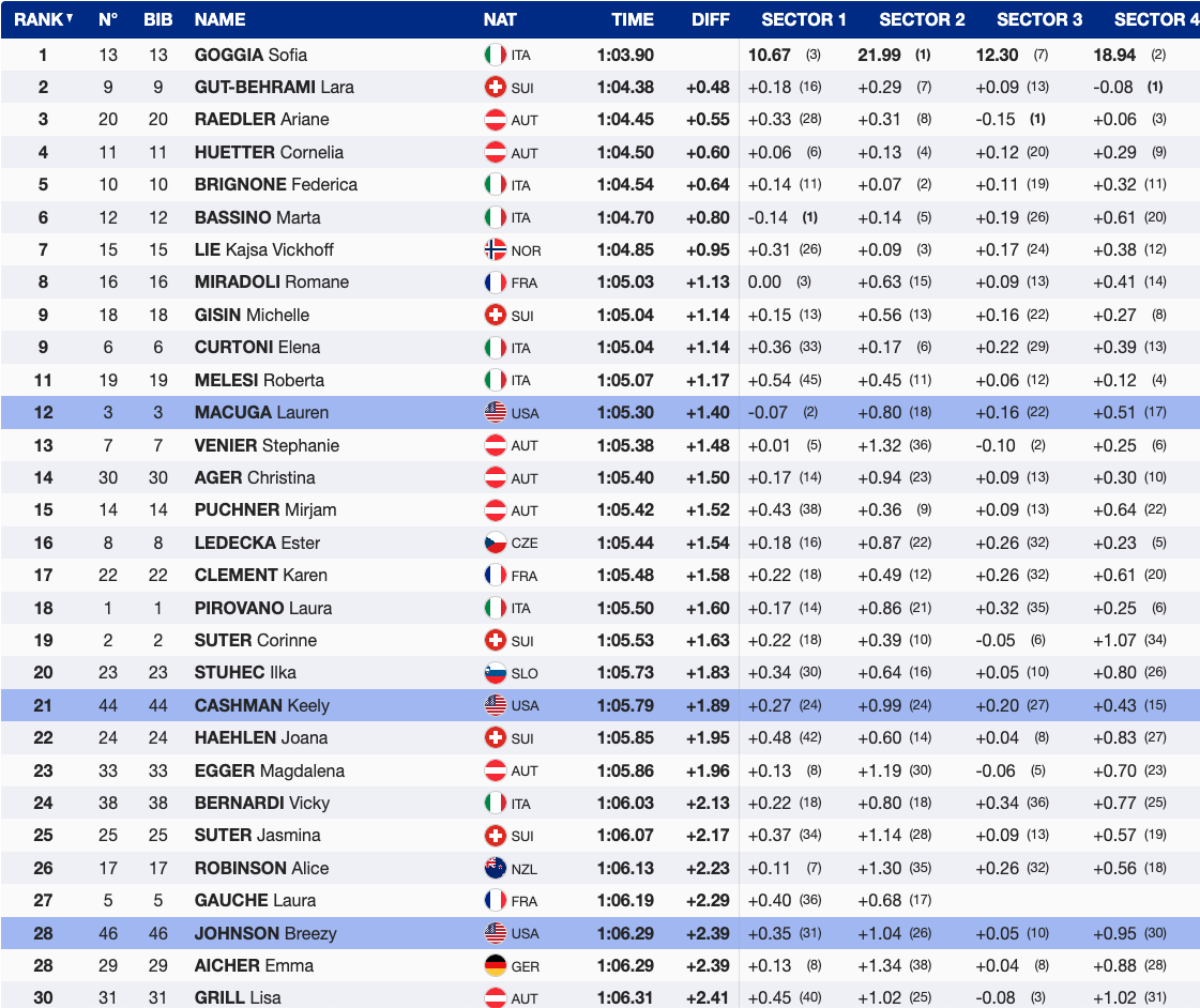 Breezy Johnson coming back from a suspension by the Anti-Doping Agency (USADA) after missing three whereabouts tests in a year concluded the day in 28th place. She was running a strong line from the start, but got pushed late at the end of the course, which cost her some time. Nevertheless, this was a promising result for her second race back.