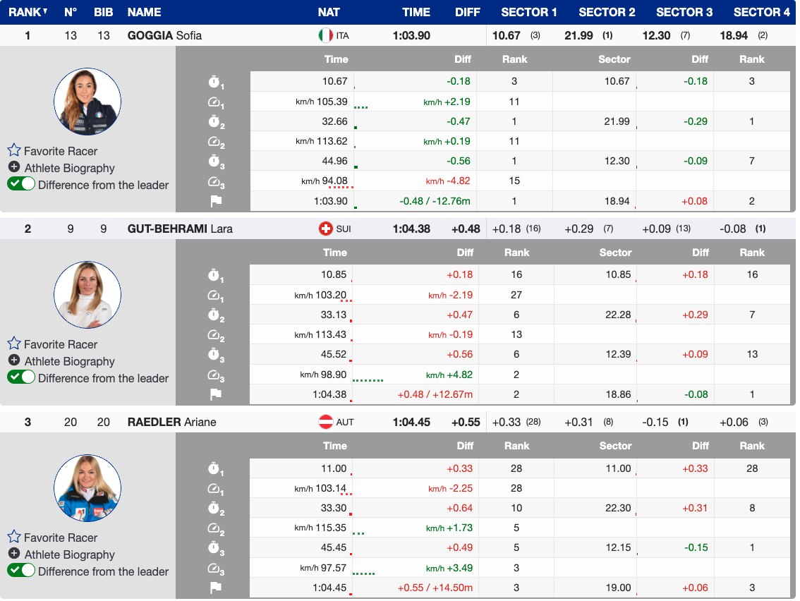 Ariane Raedler of Austria impressively punched into third place, 0.55 behind Goggia’s lead. Raedler has been racing World Cup super-G since 2019.