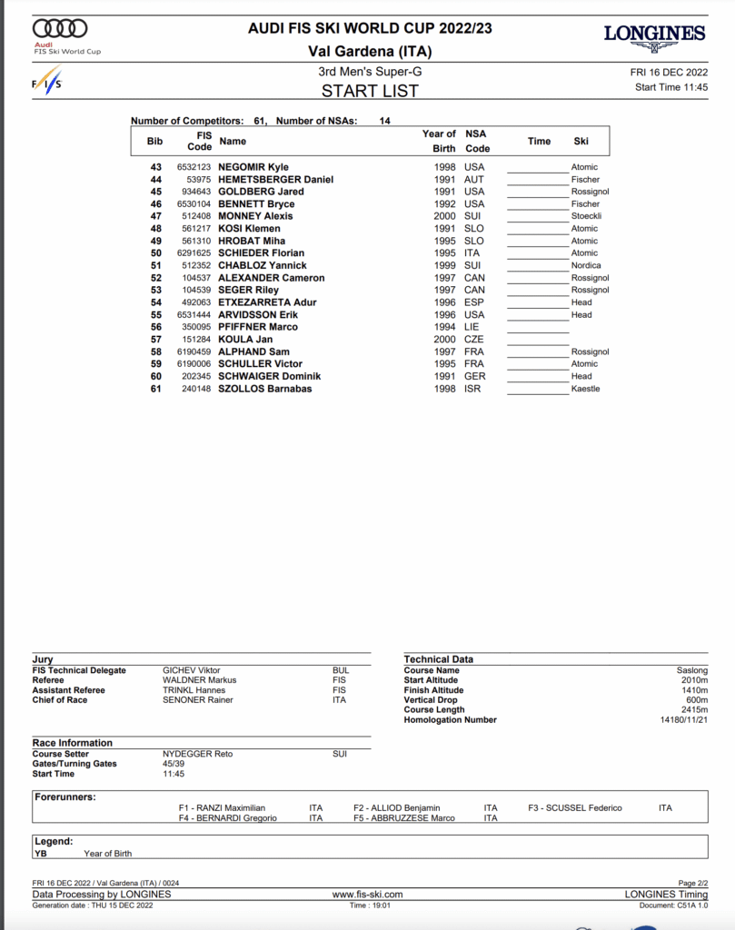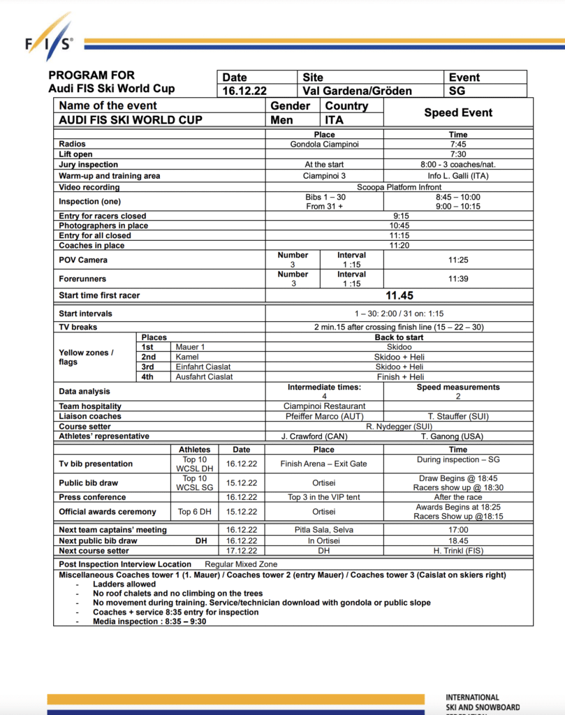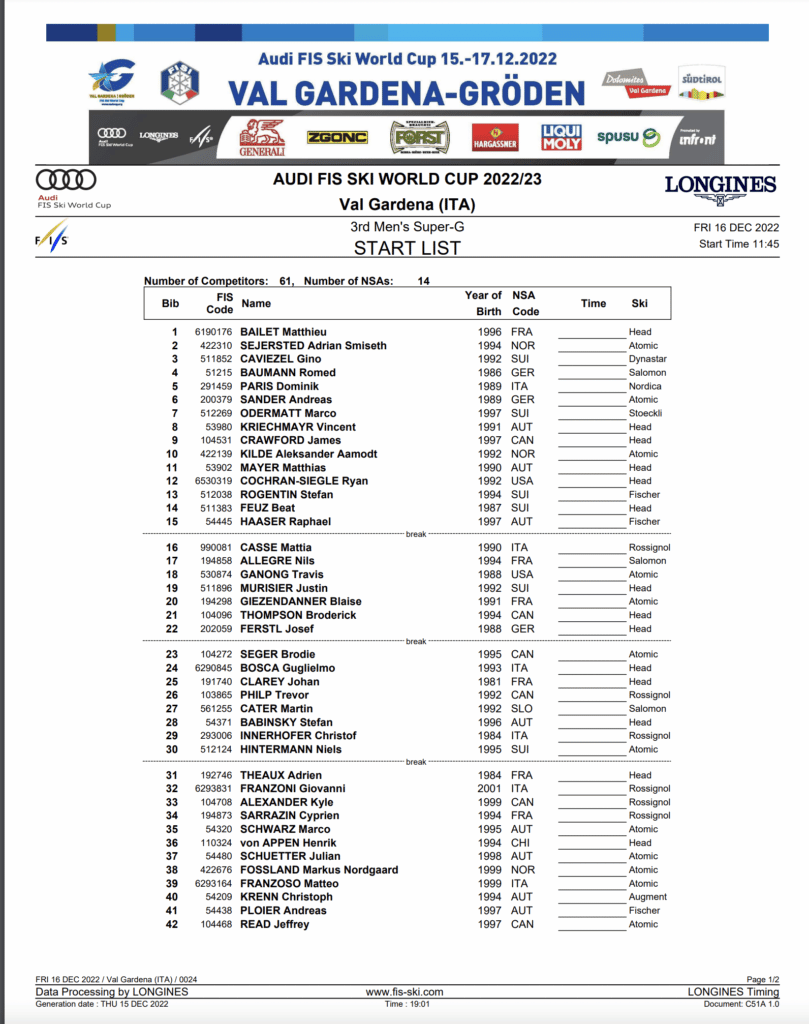 The start list and program for Thursday, December 15th Val Gardena Gröden super-G