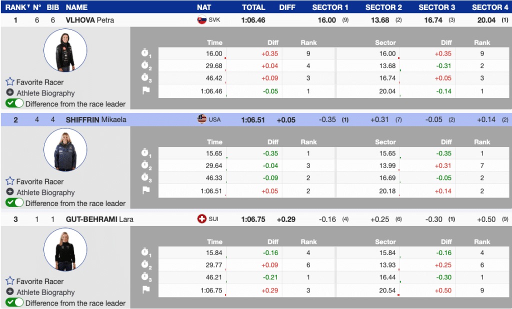 While Vlhová has consistently showcased speed throughout the season, Shiffrin has been steadily improving her Giant Slalom (GS) performance throughout the season. Her last two GS runs have been awe-inspiring to watch. Both women are skiing with evident precision, power, and confidence that is truly world-class.