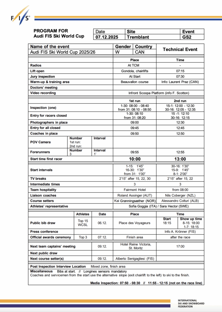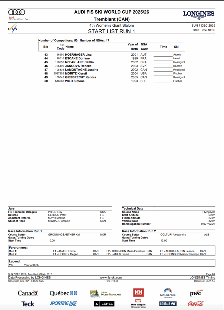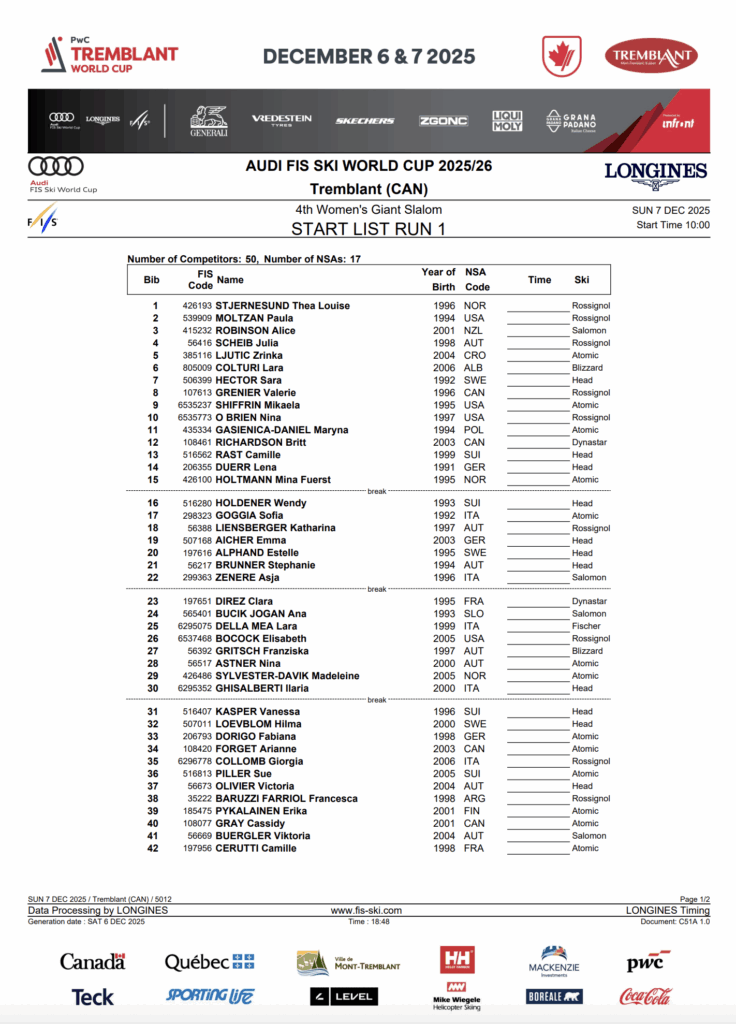 TREMBLANT, Quebec — The women close out their Mont-Tremblant weekend on Sunday, December 7, with the second of two giant slaloms and the fourth GS of this Olympic season. After three slaloms and three GS races, Alice Robinson has won back-to-back giant slaloms, while Saturday’s bronze medalist Valerie Grenier returns to her home hill looking for another big result before the World Cup packs up and heads back to Europe for the rest of the winter.