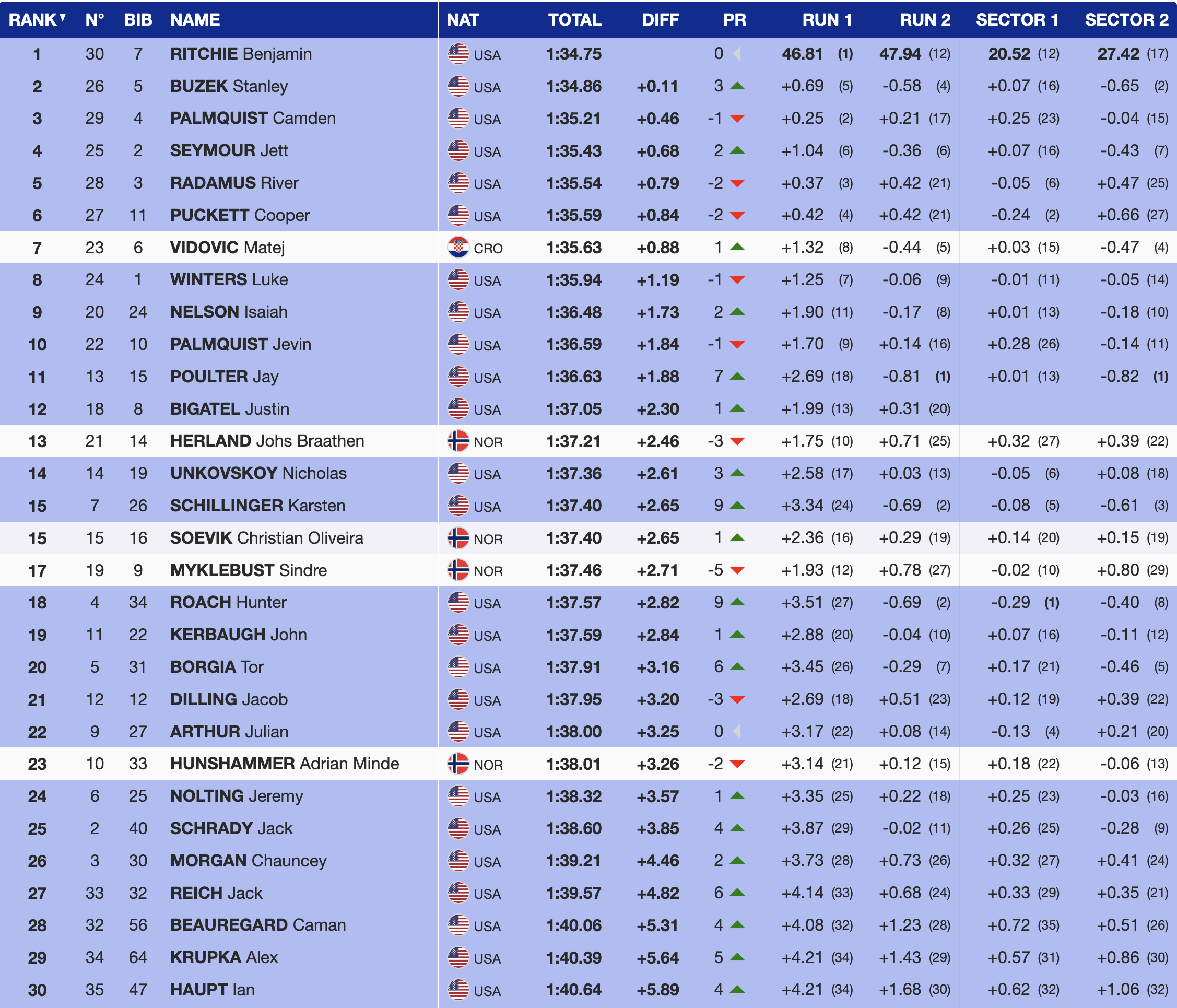 Matej Vidovic of Croatia, the only international skier in the top ten, finished seventh (+0.88). U.S. teammates Luke Winters and Isaiah Nelson followed in eighth and ninth, while Jevin Palmquist rounded out the top ten.