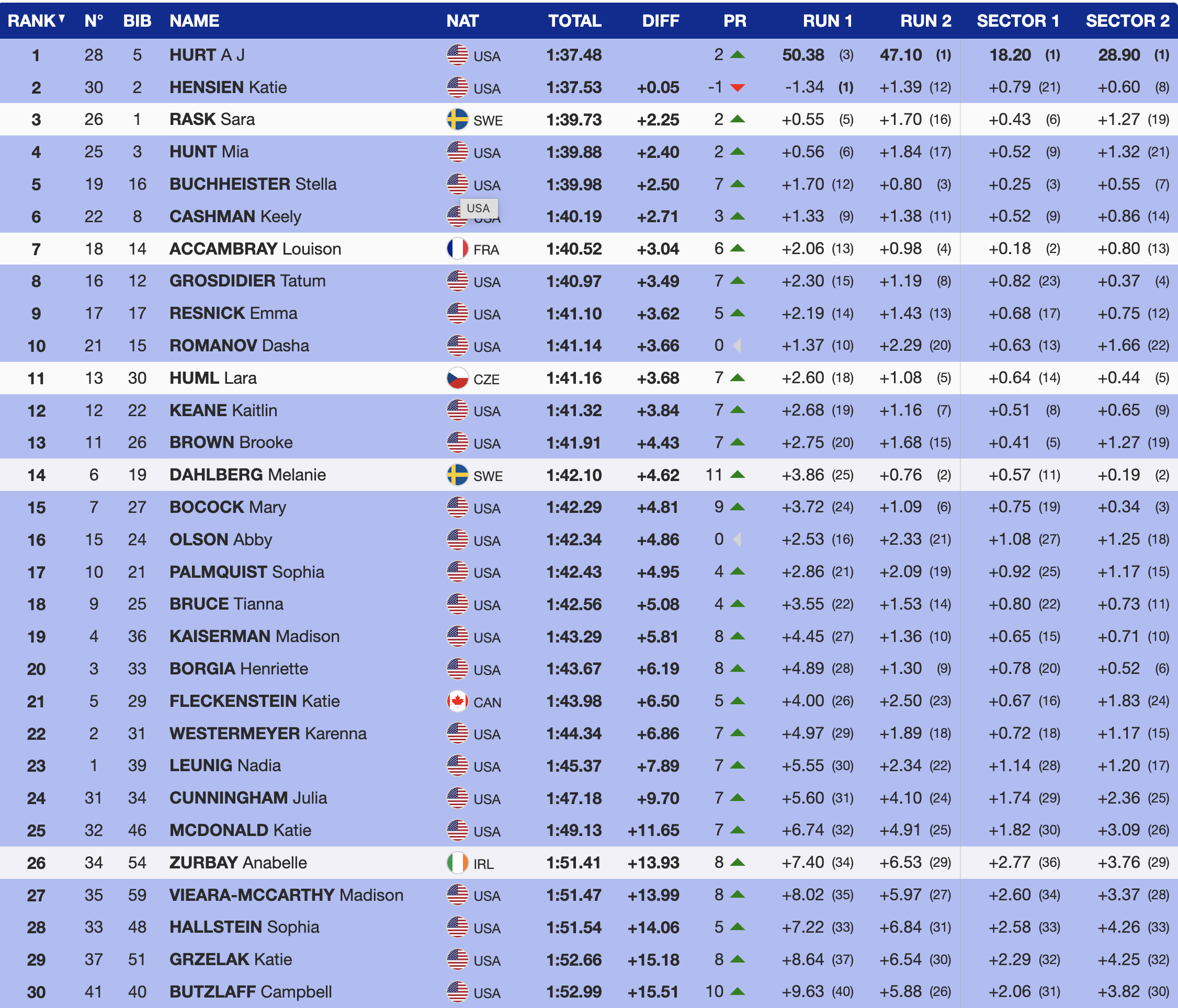 Hurt was second after the first run but attacked the second with determination. She skied at her limit, made exciting recoveries, and posted the fastest second run (47.10) to edge out her teammate Katie Hensien by 0.05 seconds. Her winning time was 1:37.48.