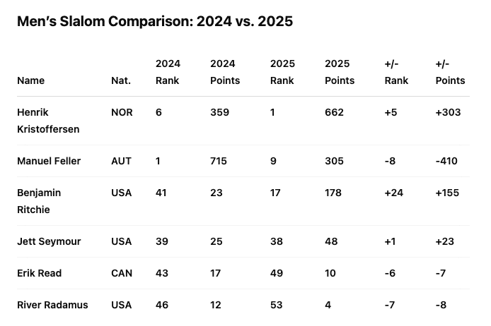 Benjamin Ritchie climbed into the top 20 overall. Jett Seymour renewed his consistency. Luke Winters is rebuilding his path back. River Radamus is always a versatile threat, and Canada’s Erik Read extended his streak of scoring slalom points to 11 straight seasons—a rare mark of longevity.
