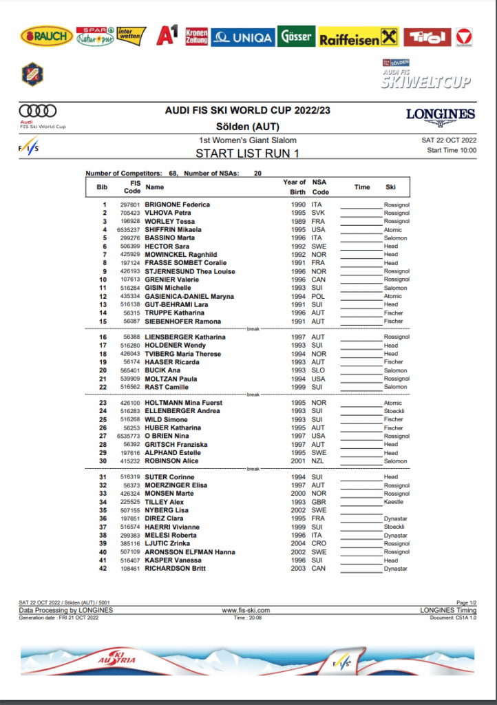 Here is a list of the US women starting in tomorrow’s Sölden women World Cup GS