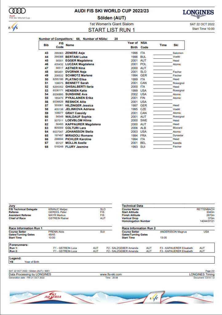 However, there is great news from Patrick Riml Alpine Director of USST. Both Nina O’Brien and Allie Resnick, who are returning from injury, will race tomorrow. This means the US will have seven athletes starting. First Run is 4:00 am Eastern time and 1:00 am in the Pacific time zone. The second run for the women will begin at 7:05 am Eastern time and 4:05 am in the Pacific time zone. Don’t forget replay will be available on Peacock.